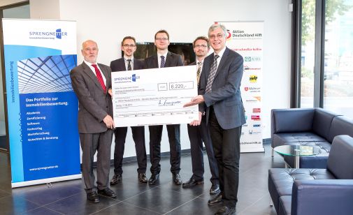 Bildunterschrift: Die Geschäftsführer und Geschäftsleiter der Sprengnetter Immobilienbewertung überreichen den Scheck an den Vertreter der Aktion Deutschland Hilft, Kai Pleuser.